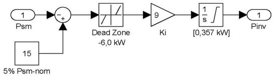 where PDL is the DL consumed power and using for PDL the same consumer load sign criteria. As the DL rated power (357 kW) is greater than the WTG rated power (275 kW), Equation (9) indicates that it is possible, by controlling the DL consumed power, to obtain a positive PDE in steady state, even with null load (PL = 0). In this article, the DL dumped power follows the PINV output shown in Figure 6 (PD-REF = PINV). The Figure 6 control is an integral one, and its aim is to keep the DG active power (PSM) in the reference range 15–21 kW (5–7% PDG-NOM) in steady state when a WTG active power excess exists. The control output PINV increases when the DG power PSM is less than 15 kW and decreases its value when PSM is greater than 21 kW. In Figure 6, the integral control is limited to the DL power limits [0, PD-NOM]. The integral constant KI of Figure 6 was tuned taking into account the used DL discrete nature. To follow PINV, the DL control must order the DL resistors to switch on and off, and this switching produces system voltage variations, as the following simulations graphics show. Therefore, excessive switching must be avoided.