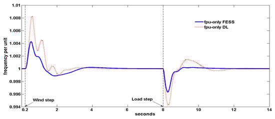 System frequency per unit for the only-FESS and only-DL cases.