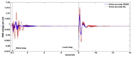 RMS Voltage per unit for the only-FESS and only-DL cases.