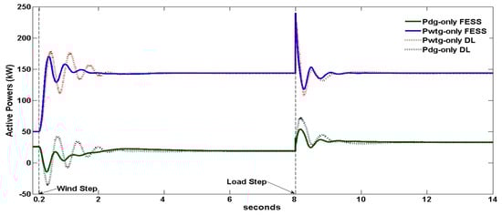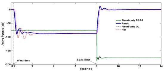 At t = 8 s, the load is increased by 100 kW as Figure 10 shows. The speed governor orders the DG to increase its power production above 21 kW, and the integral control of Figure 6 commands DL/FESS to decrease its consumed power. In DL case, the decreasing consumption of power stops when its power reaches zero and remains at that value, so that the WDPS frequency is regulated solely by the DE speed governor. In the FESS case, the FESS power has small positive peaks due to the PD regulator, which means that FESS supplies power during a brief interval until it reaches zero after the transient, so the FESS briefly supports the DE speed governor. In steady state, the DG supplies 32 kW, the WTG remains supplying the same 143 kW (for the 9 m/s wind speed), the load consumes 175 kW, and the DL/FESS consumption is 0 kW. During the +100 kW transient, the frequency decreases due to the deficit of active power, with a minimum–maximum of 0.9943–1.0014 and 0.9963–1.0002 pu for the DL and FESS cases respectively, being the frequency transient better in the FESS case. The WTG positive peak after the +100 kW of Figure 9 is due to an instantaneous increase in the SCIG slip as the system frequency falls faster than the WTG-SCIG speed. This WTG positive peak counteracts partly the active power shortage, so the WTG-SCIG provides damping to the system. The voltage minimum–maximum are 0.9754–1.0157 and 0.9874–1.011 pu for the DL and FESS cases respectively, so the FESS frequency support also results in a better voltage transient. The FESS case also provides less oscillatory waveforms and, therefore, better relative stability for the WTG and DG active powers.
