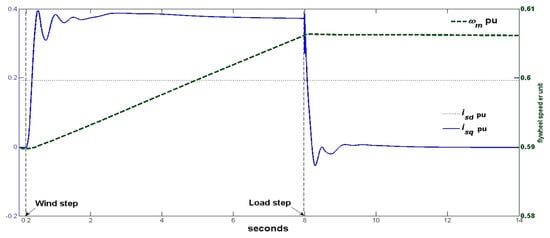Following the ASM-FOC, the direct current value is +0.1923 pu, which is the optimum magnetizing current for maximum power factor at rated power. As explained in Section 2.4, the FESS exchanged power is controlled by adjusting the ASM quadrature current as the ASM-flywheel speed can be considered fairly constant, due to the flywheel high inertia and the short length of the simulations. The initial FESS power and quadrature current are null. After the wind speed step, the 87 kW FESS consumed power is the sum of the WTG power excess (143–75 kW) and the minimum loading of the DG (19 kW), the quadrature current maximum is 0.3951 pu at t = 0.5354 s, and its steady state value is 0.3724 pu. During the +100 kW load step transient, the quadrature current has small negative peaks, which corresponds to the FESS supplying power. After the transient, the FESS power is null, and so the quadrature current returns to null value.