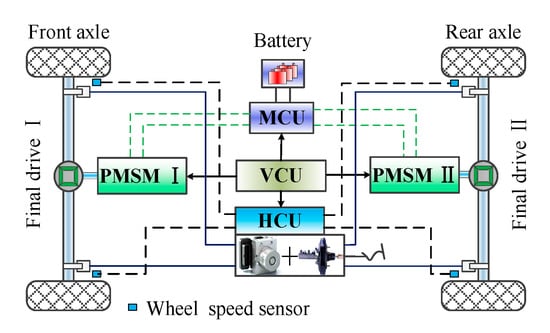 The pure electric vehicle analyzed in this paper is a front–rear centralized dual-motor driving system with two three-phase permanent magnet synchronous motors (PMSM), as shown in Figure 1. The driving forces are transmitted to the wheels from the motors through final drives I and II. The vehicle-state variables, such as vehicle speed, braking pedal displacement, and battery state of charge (SOC), are collected by an electronic control system and transmitted to the vehicle control unit (VCU) via a controller area network (CAN) bus, and the braking torques required of the MBS and the HBS are determined by the vehicle control unit. The motor braking torque and hydraulic braking torque are controlled by the motor control unit (MCU) and hydraulic control unit (HCU), respectively. The basic parameters of the vehicle are shown in Table 1.
