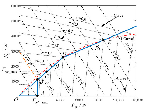 When or or , or , the braking force is provided only by the HBS, and the braking force at the front and rear axles are distributed according to the fixed braking force distribution coefficient and .