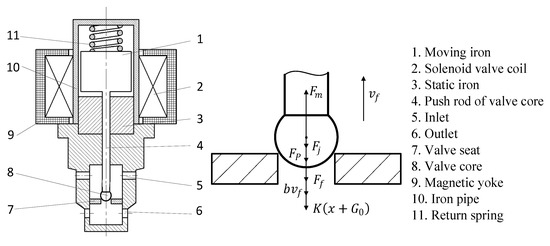 The pressure of a brake wheel cylinder is controlled by a pair of high-speed on–off valves: the inlet valve that is normally opened and the outlet valve that is normally closed. The structure of the outlet valve and the force analysis of the valve core are shown in the Figure 4. The key parameters of the high-speed on–off valves selected in this paper are summarized in Table 3.