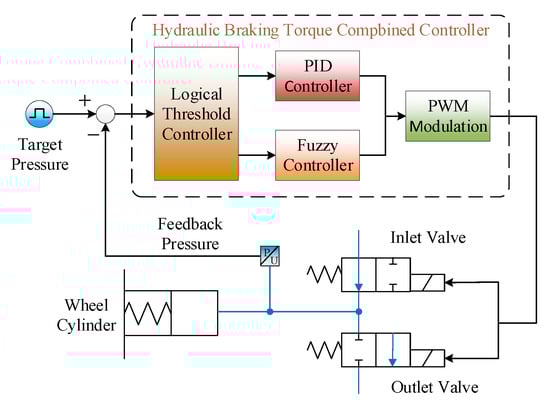 The HBS should have good control performance to achieve a fast and accurate response to the hydraulic braking force. A cooperative control strategy is used to improve the response speed and control the accuracy of the hydraulic braking torque. When the pressure error between the target pressure and the tracking pressure is larger than the value of the threshold, the PID controller controls the wheel cylinder pressure to achieve a rapid adjustment. Conversely, when the pressure error is smaller than the value of the threshold, the fuzzy controller is used to stabilize the wheel cylinder pressure near the target pressure and reduce the hydraulic pressure fluctuation [26,27]. The control schematic is shown in Figure 5. Wheel cylinder control is determined by the logical threshold controller according to the pressure error , and then either the PID or fuzzy controller determines the duty ratio of the high-speed on–off valve. The inlet and outlet valves of the wheel cylinder are directly controlled by PWM (pulse width modulation). Thus, the tracking pressure of the wheel cylinder follows the target pressure. A threshold value of 0.5 bar was set for as simulation results indicated that both the response speed and the control accuracy of the pressure in the wheel cylinder were optimal at this level.