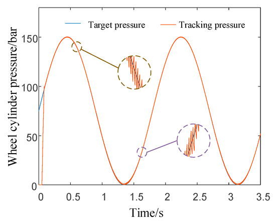 The pressure variation of a wheel cylinder controlled by the combined controller under the input of a sinusoidal signal is shown in Figure 6. The tracking pressure in the wheel cylinder is precisely controlled, and the pressure error between the target pressure and tracking pressure is very small.