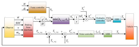 According to the analysis in Section 3.3 of this paper, the response time of the MBS is shorter than that of the HBS, thus the rapid response of MBS can be used to compensate for the insufficient braking torque caused by the slow response of HBS, so as to solve the fluctuation of total braking torque and the jerk of the complete vehicle during brake mode switching. Therefore, during mode switching, the MBS need to provide the target motor brake torque , which is determined by the braking force distribution controller and additionally provide the difference between the target hydraulic braking torque and the current actual hydraulic braking torque ; that is,