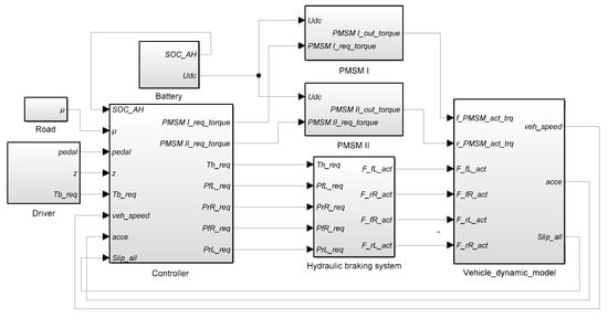 The forward simulation model of a pure electric vehicle was established in MATLAB/Simulink in this study, as shown in Figure 12. This simulation model includes the PMSM I and PMSM II models, the HBS model, the battery model, the vehicle longitudinal resistance model, and the controller model. Because the switching between different braking modes is similar, a specific mode switching can be selected for verification and analysis. The same conclusion can be obtained by the simulation of other switching processes with the proposed torque coordinated control method.