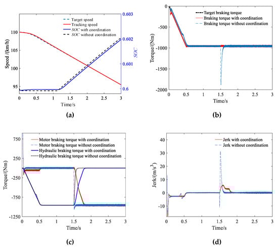 With the deceleration of the vehicle, the vehicle speed was reduced to 20 km/h at 1.67s, which is too slow for the MBS to maintain a stable regenerative braking torque; hence, the braking mode is switched from pure electric to pure hydraulic. Due to the coordination of motor braking torque to hydraulic braking torque during mode switching, the SOC with coordination is higher than that without coordination, as shown in Figure 14a. The simulation results of Figure 14b,c show that the mode switching without coordination cannot provide the braking torque required by the driver because of the rapid withdrawal of the motor braking torque, giving a wrong braking felling to the driver, resulting in a mis-operation by the driver. With coordination, the motor braking torque decreases as the hydraulic braking torque increases, creating a smooth transition, so that the total braking torque changes gradually and the speed of vehicle is steadily reduced. According to Figure 14d, the maximum jerk of the complete vehicle during mode switching with and without coordination was -3.14 m/s3 and -21.18 m/s3, respectively. Thus, the coordination control strategy improves the vehicle’s safety and ride comfort during braking mode switching.