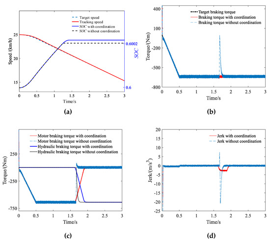 Simulation results of the pure hydraulic switch to a pure motor braking mode under a constant braking strength: (a) The variation in vehicle speed and SOC, (b) the variation in total braking torque, (c) the variation in motor and hydraulic braking torque, and (d) the variation in vehicle jerk.