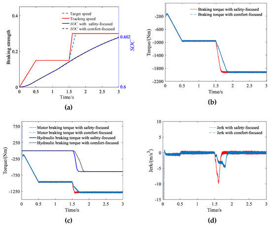 The driver depressed the brake pedal to the same opening with two different brake pedal stroke change rates; therefore, both the switching processes are switched from pure electric to the hybrid braking mode. Because the change rate in brake pedal stroke is different, one switching process focuses on brake safety while the other focuses on ride comfort. The simulation results in Figure 15 are all obtained by the coordinated control strategy proposed in this paper. It can be seen from Figure 15a that since the variation in each braking torque is almost the same for both the safety-focused and comfort-focused intentions, the SOC changes of the two braking intention are almost the same, but the SOC with a safety-focused intention is slightly higher than that of the comfort-focused intention.