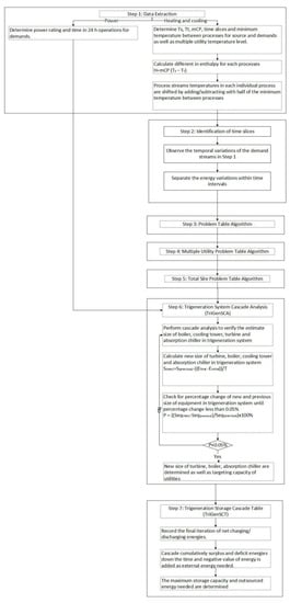 Figure 1 describes the overall systematic approach suggested in this paper. The overall methodology consists of seven steps which are data extraction, identification of time slices, Single Utility Problem Table Algorithm (SU PTA) on both energy generation/consumption, Multiple Utility Problem Table Algorithm (MU PTA) on both energy generation/consumption, Total Site Problem Table Algorithm (TS PTA) on energy consumption, Trigeneration System Cascade Analysis (TriGenSCA), and Trigeneration Storage Cascade Table (TriGenSCT).