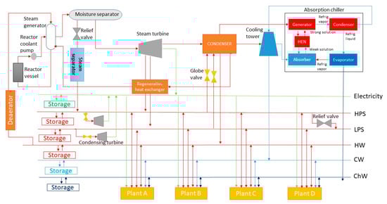 A graphic representation of the design of the Pressurized Water Reactor Nuclear Power Plant (PWR NPP) as a trigeneration system supplied energy to a Total Site.