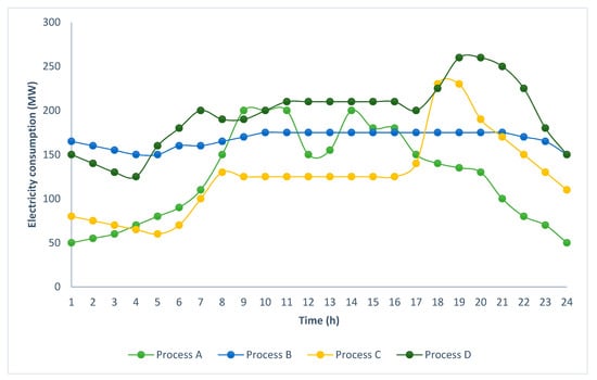 Hourly highest power demands based on industrial plants A (data from Li et al. []), B (data from Hobby et al. []), C (data from Ho et al. []), and D (data from Li et al. []).