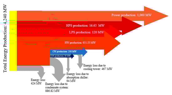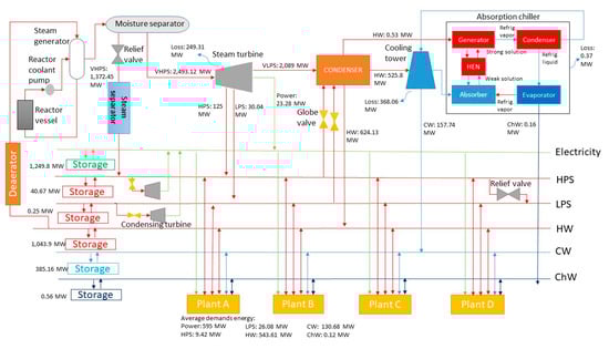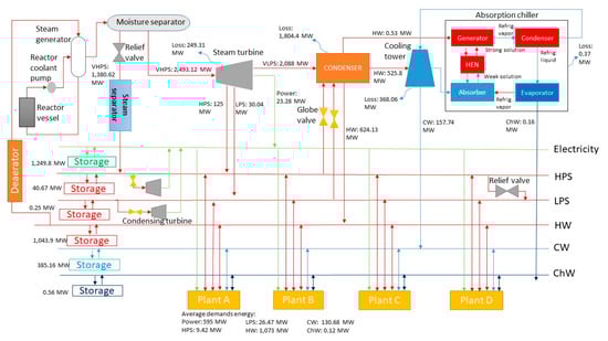 In the first step, the energy supply from the trigeneration system and the demand data from industrial plants are needed. Data extraction is divided into two sides, the power side and the heating/cooling side. Data is collected from the industrial demand requirement at the site for actual data collection. Furthermore, to illustrate the suggested approach, the demand data from the power side are taken directly from the literature. Figure 3 shows the hourly highest power requirements of four industrial plants and Figure 4 summarizes the total power requirements needed based on four industrial plants. Power generation uses PWR NPP as a trigeneration system. Several types of PWR NPPs, such as UNITHERM, are transportable NPPs capable of generating energy for power generation, district heating and process steam generation []. Initial output power for PWR is assumed to be operated at maximum turndown ratio at 1060 MWe. The model of the PWR is taken based on the Three Miles Island in the efficiency of 25% []. The maximum turndown ratio is defined as a full-scale capacity of operating value in the trigeneration PWR NPP system. By considering the efficiency of the double extraction steam turbine by 25%, the total thermal energy required is 4,240 MW of thermal to produce maximum turndown ratio in PWR NPP. The preliminary assumption is made where the distribution of the total thermal energy is (1) 1060 MWe of power; (2) 16.65 MW of HPS; (3) 120 MW of LPS; (4) 631.53 MW of HW; (5) 200 MW of CW, and (6) 40 MW of ChW. The total overall thermal efficiency is assumed to be 10%, and the initial production of CW and ChW is 200 MW and 40 MW. Haldkar et al. [] stated that the energy losses in the condenser are around 61% of the energy input that is lost to the surrounding through a cooling tower or supplying the cooling water to the chiller. Figure 5 shows the energy balance for a trigeneration system at the maximum turndown ratio.
