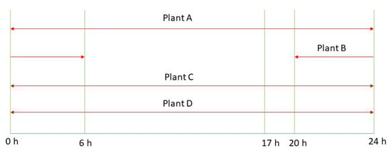 Shifted temperatures for process cold streams can be determined as temperatures of cold streams can be formed into shifting temperatures of cold streams by adding half of the minimum temperature between processes, while temperatures of hot streams are shifted to shifting temperatures of hot streams can be determined by deducting half of the minimum temperature between processes. Based on Varbanov and Klemeš [], the values of the minimum temperature between processes for Plants A and C are set to be 20 °C and Plants B and D are set to be 10 °C. Table 6 shows multiple utility temperature levels data available at the plants.