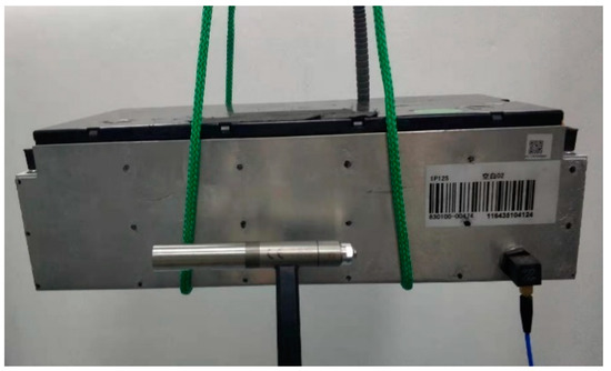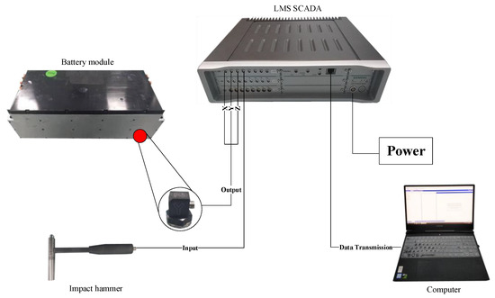 The analysis performed on the battery module was a free–free modal analysis. Ideally, the measured object needed to be completely free floating, but this was impossible to achieve in the actual testing process. In this experiment, the battery module was suspended with a nylon rope to simulate the free boundary conditions. Generally, the highest rigid body frequency of the supporting structure was required to be lower than the lowest elastic frequency of the measured object, which could reduce the effect of the suspension system on the modal test of the battery module [36]. From the test results, it could be seen that this suspension support met the requirements. According to the literature [38], the metal hammer tip with a greater rigidity was chosen for this analysis. Generally, the exponentially decaying window needed to be implemented to minimize the leakage effect for a lightly damped structure, but no window was applied to the measurement data in this experiment due to the relatively high damping of battery module. The experimental parameters used in this test, are shown in Table 2 and the test process is shown as Figure 3.