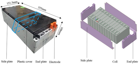 The development of new energy vehicles (NEVs) is imminent, due to the urban air pollution and crude oil consumption in China [1] and the rest of the world [2]. However, the core component of an electric vehicle is the battery pack, which has two critical parts, the battery management system (BMS) and the lithium-ion batteries (LIBs). If BMS is considered to be the brain of NEVs, then the LIBs can be considered to be the heart. LIBs are the first choice of an NEV power battery due to their high-energy density [3]. However, these characteristics also lead to more serious accidents than traditional fuel vehicles. The vehicle is subject to random vibration when driving on the road [4]. If the excitation frequency is close to the natural frequency of the battery pack it would cause resonance, which would seriously damage the electrical and mechanical components inside the battery pack [5,6], reduce its fatigue life, and ultimately increase the possibility of severe accidents. Therefore, it is essential to figure out the vibration mechanism of the battery pack through experiments and simulations. As the most important part of the battery pack, the battery module is becoming a standard component like the battery cell [7]. Thus, it is necessary to comprehend the structural dynamics of the battery module for designing a qualified battery pack.