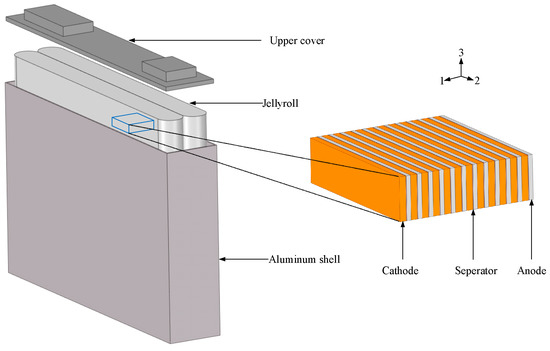 As shown in Figure 5, the prismatic cells used in this study were composed of a thin aluminum shell, an upper cover, and two jellyrolls. In general, the equivalent physical parameters of the linear materials could be obtained through an impulse excitation test [39]. However, due to the gaps between the aluminum shell and the jellyroll, the microscopic gaps between the layers of jellyroll and porosity of jellyroll, the prismatic cell has a strong non-linearity [26,27].