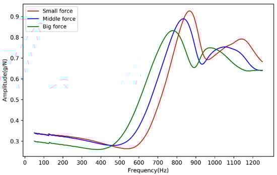 The frequency response curve of the same point changed with the size of the knocking force. The experimental results are shown in Figure 6, which were consistent with the conclusion of Berg [27]. Therefore, the equivalent physical parameters of the prismatic cell could not be obtained through the impulse excitation test [39]. As shown in Figure 5, the jellyroll, a kind of multi-layer system, could be regarded to be a transversely isotropic material [33]. The equivalent physical parameters of the material could be obtained through compression tests in different directions.