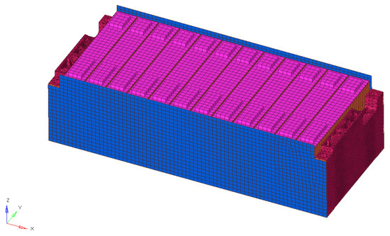 The main components of the battery module were the side plate, the end plate, and the cell. In the modal analysis of the battery module, it was necessary to simplify the structure which had a little influence on the modal parameters. Therefore, the plastic cover, electrical components, and the electrodes were removed, leaving the side plate, the end plate, and the cell. The connection type in the finite element model was bonding, as the components of the simplified module were bonded with AB glue. Three different numerical battery module models with different cells were established and the cell was discretized separately, as described in Section 4.1. Due to its irregular shape, the tetrahedral-shaped solid185 element was used for the end plate and the side plate had the same element type as the aluminum shell. Model 1 considered the structure of the aluminum shell of the cell and the number of finite element meshes was 103,914. In model 2 and model 3, the cell was treated as a homogeneous body, and the number of finite element meshes was 85,890. However, Model 2 considered the multi-layer system of the cell and made the cell a transversely isotropic material. Differing from Model 2, Model 3 was equivalent to isotropic material. The final finite element mesh for Model 1 is shown in Figure 8.