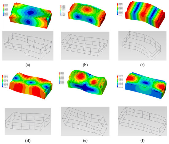 After the simulation results were obtained, it was found that the mode shape results of Model 1 considering the aluminum shell structure could not match the experimental results, and the first six natural frequencies obtained were obviously larger than the experimental results. This meant that this detailed modeling method for the cell could not properly characterize the dynamic performance of the module. The mode shape results of Model 2 obtained by simulation are shown in Figure 9, which perfectly matched the experimental results. The animations for experimental and simulation mode shape of Model 2 could be found in supplementary materials.