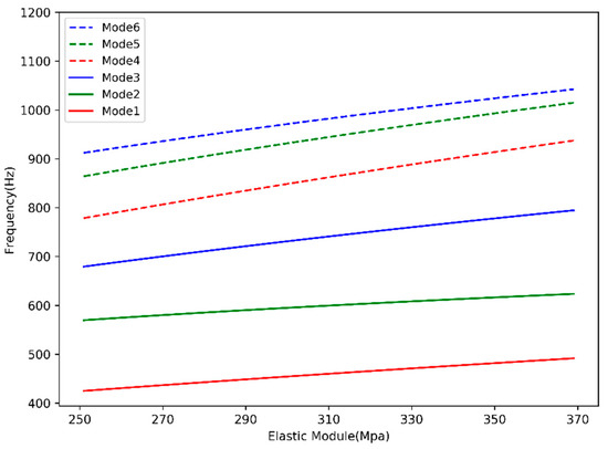 Figure 10 shows the curve of the objective function value L as the equivalent elastic modulus of the cell changes. It can be seen from the curve that at E = 297 Mpa, the value of the objective function reached a minimum, and the mode shape results matched the experimental results. This meant that E = 297 Mpa was the global optimal value for the objective function. Another interesting result is shown in Figure 11. The natural frequency of each mode of the battery module increased linearly with the increase of the elastic modulus, and the smallest slope was the second order, followed by the first order, and the fourth order was the largest. The mathematical expression between the natural frequency of the battery module and the elastic modulus of the cell could be obtained. In practical application, this kind of mathematical expression was able to offer guidance for engineers to find the optimal equivalent elastic modulus of the cell, without spending too much computing resources and performing repeated finite element calculations.