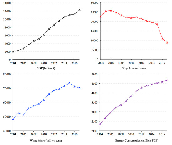 GDP, major pollutants and energy consumption of China for 2004–2017. The GDP data are from World Bank Open Data and measured in current US dollars. Data on SO2, wastewater and energy consumption are extracted from the China Statistical Yearbook.