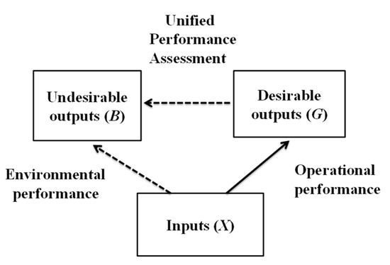 Figure 2 depicts the relationship among three production factors (X: an input vector, G: a desirable output vector and B: an undesirable output vector). As depicted in Figure 1, all DMUs uses X to produce G. The production of G is usually associated with B. Thus, B is “by-products” of G, both of which are originated from the utilization of X. The more G and less B produced, the better the performance in this assessment. The relationship is referred to as the “null-joint hypothesis”.