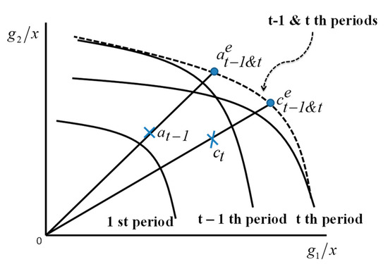 To visually describe the importance of such a time accumulation in DEA measurement, this study includes Figure 4, which depicts a possible occurrence of the frontier crossover between the (t−1)-th and t-th periods. The horizontal axis indicates g1/x and the vertical axis indicates g2/x. The figure drops b by assuming that b is the same for all DMUs. The performance of DMUs in Figure 4 is measured under the assumption of natural disposability. The figure shows that the efficiency frontier shifts between the two periods. As a result, it is necessary to combine the two frontiers to form a new efficiency frontier, which is indicated by the dotted curve in Figure 4. The performance of DMU {a} is observed as at−1 at the (t−1)-th period, and DMU {c} is observed as ct at the t-th period. Both need to shift their locations to and on the newly shaped (dotted) efficiency frontier for the t−1 and t periods. The superscript (e) indicates an efficiency frontier. This type of crossover may occur between any periods from p = 1 to p = t. Therefore, Model (1) combines all periods in their left hand of the formulation.