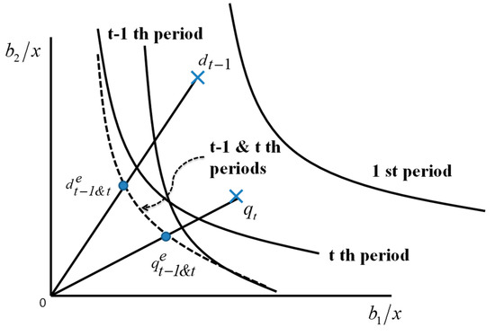 In a similar manner, Figure 5 visually describes a frontier crossover between the t−1 and t-th periods under managerial disposability. The horizontal axis indicates b1/x and the vertical axis indicates b2/x. For our visual description, the figure drops g from Figure 5 by assuming that g is same on all DMUs. The performance of DMUs in Figure 5 is measured by managerial disposability. In the figure, an efficiency frontier retreats between the two periods. Hence, it is necessary to combine the two frontiers to shape a new efficiency frontier, or the dotted line in Figure 5. The superscript (e) indicates an efficiency frontier. This type of crossover may occur between any periods from p = 1 to p = t. Therefore, Model (4) combines all periods in the left hand of the formulation.