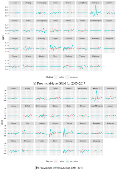 Provincial-level SGN, SGM and SGNM for 2005–2017. SGN, SGM and SGNM are based upon Models (1), (4) and (7). When is included as an output (i.e., the curve “no carbon”), the results are available for 2005–2015 and all provinces except Tibet.