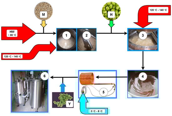 Both beers were produced in a pilot-scale brewing installation, similar to a typical, small restaurant located, craft brewery, located at the Wrocław University of Science and Technology. This installation allows producing approximately 1 hl of beer per batch, with full control over each individual unit operation of the process (Figure 1). The installation uses electricity for simplicity and convenience. However, the process heat and cold necessary for some unit operations of the brewing process (Figure 1) can potentially be delivered by other means, from other sources.