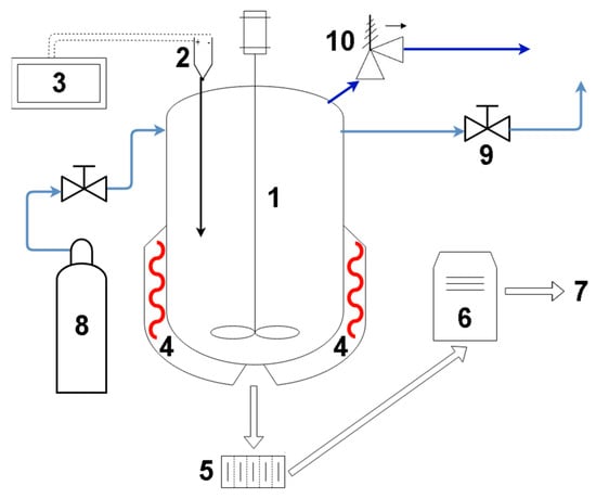 Diagram of the experimental hydrothermal carbonization (HTC) rig (1–Autoclave; 2–type K thermocouple; 3–PLC controller; 4–heating mantle, with band heaters; 5–draining; 6–dryer; 7–analysis of dry sample; 8–nitrogen for purging; 9–purging valve; 10–pressure relief valve).