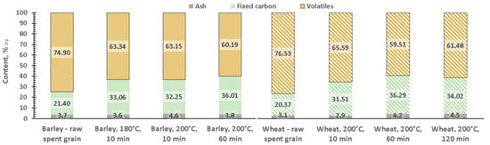 Results of proximate analysis (Figure 3) showed that in terms of fuel properties, both types of spent grain were similar. As expected, hydrothermal carbonization resulted in a decrease of volatile matter content, for both feedstocks. This is in good qualitative agreement with literature results for many different types of biomass [40,43,67,68].