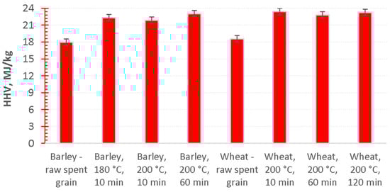 Increased higher heating values of hydrochars were obtained, in comparison to corresponding feedstocks (Figure 4). This is a direct consequence of the results of the ultimate analysis, as HHV was calculated for each sample, using Friedl formula (1). Nonetheless, the results obtained with this formula should be regarded as accurate for several reasons. Firstly, the standard error of calibration of 337 kJ/kg and an R2 coefficient of 0.943 achieved during validation of the against the experimental results [58,69]. Secondly, cereals were used among the materials, used for the validation formula. As grains of various types of cereals are feedstock materials for malts, this could be considered as a material relatively close to the spent grain. Finally, the increase in HHV of material, after hydrothermal carbonization, is generally accepted trend, confirmed for various different types of feedstocks [67,70].