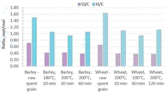As could be reasonably expected from HTC process, carbonization resulted in increased C content and decreased O content, which is rather typical for this process [47,71,72]. In general, significant decrease in the oxygen content and O/C ratio (Figure 5) suggests that HTC could be a suitable pretreatment if the spent grain was meant to be used as a biorefinery feedstock, as available literature considers high oxygen content detrimental for the quality and stability of the pyrolysis oil, attributed to the oxygenated compounds [73,74,75].