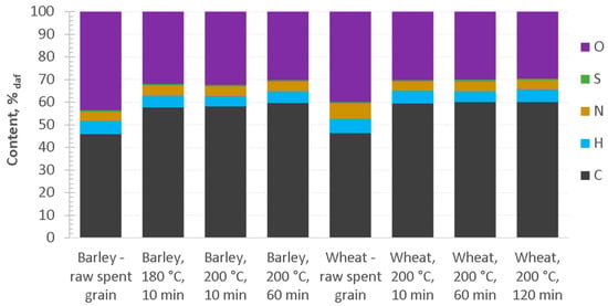 One difference between the two feedstocks that can be clearly observed is the nitrogen content (Figure 6), which was 3.96% daf for barley and 6.86% daf for wheat BSG. Relatively higher nitrogen content of wheat spent grain could be attributed to relatively higher protein content in wheat [76,77].
