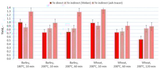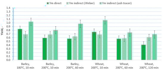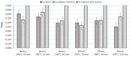 Overall, the indirect method for determination of the mass yield, developed by Weber et al. [49], could give satisfactory results for most of the cases (Figure 7). Only in the case of HTC of spent grain from wheat-based beer, performed at 200 °C for 120 min, the difference between the mass yield, determined by the direct and indirect method, was significant. On the other hand, the use of ash tracer method leads to significant overestimations of the mass yields, in all of the cases (Figure 7). For the results obtained by Weber method, it seems plausible to suspect that the difference was caused by the fact that inorganic content was affected to the greatest extent by the HTC process, performed at relatively long residence time. Both ash tracer method and Weber method, are based on the assumption that all of the ash, originally present in valorized biomass, remains in the solid product [49,63]. However, the Weber method compares the content of ash and fixed carbon combined, thus making the influence of any loss of inorganic part from solid fraction smaller [49]. If Ym, determined by ash tracer method (5), is used with respective ash contents of feedstock and product to calculate the Ya (7), then the value of 1.0 is obtained in all of the cases (Figure 8), according to the assumption made for inorganics. However, ash yields obtained, using mass yields determined by the direct method, are smaller than 1.0 in each of the cases. This indicates that a part of inorganic fraction of the original spent grain is lost. This is well in line with generally accepted consensus for hydrothermal carbonization and has been confirmed by a multitude of results from different studies, performed with different types of biomass [27,31,78,79]. Most certainly it is the case of HTC of BSG, even though a part of inorganic substance susceptible to precipitation into liquids is washed out from the malt, during the brewing process, which can be confirmed by a high content of macronutrients in various beers [80]. Poerschmann et al. [52] performed ash analysis of BSG from Reudnitzer Brewery (Leipzig, Germany) and hydrochars produced at 200 °C and 240 °C. Recovery of ash was ranging between 70% and 75% of the original mass of inorganics [52], and in case of K, only 12% to 14% remained in the solid product [52]. Poerschmann et al. [52] reported mass yields for HTC of BSG, ranging between 0.511 and 0.475, at temperatures between 200 °C and 240 °C, with the residence time of 14 h.