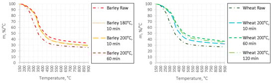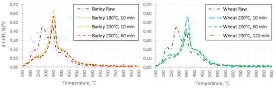 More stark differences, between feedstocks and corresponding hydrochars were revealed by TGA (Figure 10) and DTG (Figure 11) analysis for pyrolysis of the samples of BSG and corresponding hydrochars. Significant differences could be observed between DTG graphs of raw BSG samples and their hydrothermally carbonized counterparts (Figure 11). For both of the cases, raw spent grain has two distinctly different DTG peaks, one at approximately 280 °C and another close to 340 °C (Figure 11). Spent grain from wheat beer also has a small peak at approx. 225 °C, whereas for raw barley BSG this peak is minuscule and can be hardly distinguished from the adjacent shoulder (Figure 11).
