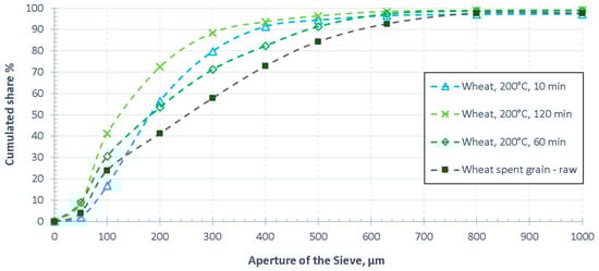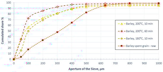 Figure 12 and Figure 13 show particle size distribution of dried spent grains and corresponding hydrochars. It can be clearly seen that HTC process had positive influence on the grindability for both feedstocks (Figure 12 and Figure 13). However, the extent of the improvement in the grindability, due to use of the HTC process, was different for spent grain from barley and wheat beers (Figure 12 and Figure 13). This could be attributed to the addition of small, slashed branches of juniper, which is fibrous, lignocellulosic biomass. Moreover, malt is a subject of comminution before brewing, and during the process, malt is further broken down physically and thermally, during mashing, lautering and boiling (see Figure 1). Furthermore, the growth of the yeast during fermentation can be considered as a contribution of a part of the mass of the spent grain, at the end of the brewing process [86], which by nature is not hard and durable, thus easy to grind. It could be sensible to recommend further research on the influence of this friable nature on the pelletizing behaviour, as some studies have already reported relatively easy pelletizing of hydrochars [29,87]. According to some of the published studies, it is possible to decrease the energy requirement for pelletizing decreased by half and three quarters, in comparison to typical wood pellets torrefied wood pellets, respectively [88].