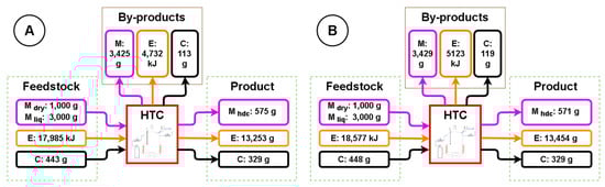 Mass, energy, and carbon balance for selected HTC parameters: A–Barley-based BSG after HTC at 200 °C, 60 min; B–Wheat-based BSG after HTC at 200 °C, 60 min. (M–mass; Mdry–mass of dry solids; Mliq–mass of water; Mhdc–mass of dry hydrochar; E–energy; C–carbon).