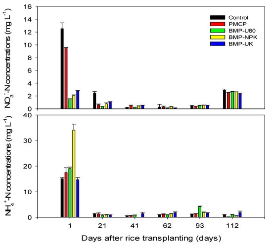 The NH4+–N and NO3−–N concentrations in the surface paddy water are presented in Figure 2. At the first day of rice transplanting, the NH4+–N concentration of surface paddy water in the MBP-NPK was significantly higher than the other treatments, but its control showed nearly the same values than the other treatments. However, the NO3−–N concentrations in the control and PMCP were only significantly higher than those in the SBMPF treatments. It was observed that NH4+–N concentrations in the treatments were higher on the first day of rice transplants, but similar to the rest of the days. The loss of nitrogen under the application of SBMPF was almost complete within 21 days after rice transplantation. This might be due to the adsorption of NH4+–N by the applied biochar in the soil. Regardless of the treatments at 112 days of rice transplanting, the NO3−–N concentrations were higher compared with other sampling days (93 days) due to the start of drainage of the surface water in the rice paddy. The study showed that the application of SBMPs can be a solution to mitigate the loss of nitrogen and phosphorus [44].
