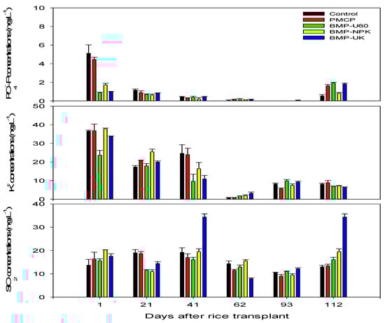 The PO4−–P, K+, and SiO2 concentrations in the surface paddy water under application of BMPFs are described in Figure 3. The measured PO4-–P concentration in the control and PMCP treatment was 2.8–5.3 times higher than the value in BMP-U60, BMP-UK, and BMP-NPK, respectively, until 21 days after rice transplantation. The PO4-–P concentrations were not significantly different (p > 0.05) from 41 days to 93 days after rice transplanting among the treatments. The greatest differences in K+ concentrations can be seen at 41 days after transplant. The higher values in the control and PMCP were 28.5 mg L−1, and the lowest in the BMP-U60 was 9.6 mg L−1, but not significantly different (p > 0.05) with that of BMP-UK.