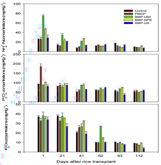 NH4+–N, P2O5 and K2O concentrations under different treatments in the paddy soil during rice cultivation. The values displayed are averages of triplicate samples with the standard deviation.