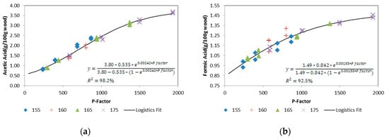 Formic acid yields show a similar trend to acetic acid (Figure 7b), though unlike acetic acid, its source is not well understood. Some is certainly the result of the losses associated with degradation of hexoses to HMF and subsequent degradation of HMF [33]. Other sources are currently unknown. The shape of the formic acid plot and reasonable fit with a logistics model suggests that some reservoir or source of formic acid exists that is being depleted, which does not clearly fit with the source of this material being hexose sugars and related degradation. Some un-identified secondary source of formic acid seems likely. An illuminating point becomes apparent when comparing the total of the acetic and formic acids with apparent quantity of acid indicated by titration (converted to mol/100 g wood, Figure 7c). There appears to be a consistent gap between the titrated and HPLC acid concentrations, which is in fact the case, as shown in the “difference” series in Figure 7c. This difference averages 0.017 mol/100 g wood, and has a coefficient of variation of only 9%. As the HPLC method would convert any acid salts (e.g., potassium acetate) to free acid (potassium sulfate and acetic acid), it seems that this difference is likely due to soluble acetate and formate salts of ash removed from the wood (e.g., sodium, potassium, calcium, magnesium, etc.). This constant quantity of organic acid salts suggests that effectively all ash removal (a known effect of HWE, though not one measured here) occurs before 230 P-factor. Finally, methanol is a known product of HWE, and is generally assumed to be lignin or glucuronic acid derived. Methanol generation in HWE also appears to fit a logistic model, as shown in Figure 7d. The plateau at higher P-factors, along with the logistic fit, seems to indicate a reservoir of methanol source material that is depleted by the extraction, with a maximum available quantity of 0.83 g/100 g wood.