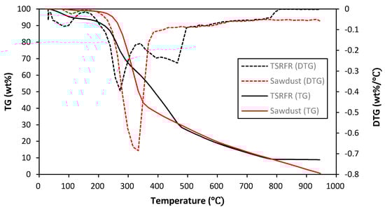 Thermogravimetric (TG) and derivative thermo-gravimetry (DTG) curves of TSRFR and pine sawdust.
