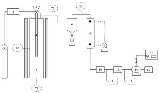 Schematic diagram of the experimental setup: 1—air supply; 2—mass flow controller (MFC); 3—feeder; 4—feeding pipe; 5—furnace; 6—cyclone; 7—residue box; 8—scrubber; 9—water circulation pump; 10—fabric filter; 11—activated carbon bed; 12—filtering system; 13—gas pollutants sampling; 14—gas vacuum pump; 15—dry gas meter; 16—micro GC.