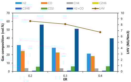 Gas composition and LHV at different equivalence ratio (ER) for TSRFR gasification.