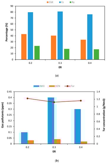 Figure 4a shows CGE, Cc, and Ry with ER for TSRFR gasification. CGE, which is a major criterion of measuring gasification performance, was determined by combustible gaseous compositions and Gy []. In this case, CGE ranged from 33.47–42.92%, and with increasing ER, CGE showed a gradually decreasing trend. Highest CGE (42.92%) was obtained at ER 0.2. Cc was calculated by using Equation (3) and it ranged from 76.12–80.91%. Highest Cc took place at ER 0.3 and it was 80.91%. Ry was calculated by using Equation (5) and it ranged between 17.33–23%. With increasing ER, Ry showed a decreasing trend. At higher ER, more oxidation reaction takes place [], more oxidation means less residue yield and that is why we obtained this kind of trend.